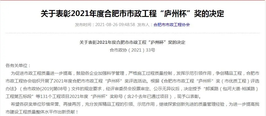此獎(jiǎng)的獲得,是合肥市人民政府、合肥市市政工程協(xié)會(huì)對(duì)集團(tuán)公司承建工程質(zhì)量的充分肯定,集團(tuán)公司將繼續(xù)嚴(yán)格把控工程質(zhì)量,高標(biāo)準(zhǔn)、高要求狠抓項(xiàng)目精細(xì)化管理,力爭(zhēng)打造更多優(yōu)質(zhì)工程。